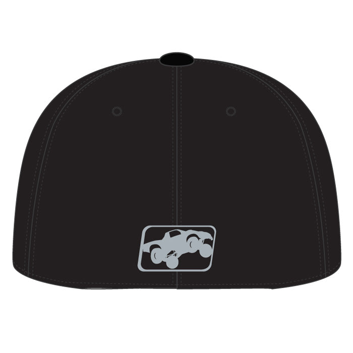 4130 Stacked Logo FlexFit 210 premium fitted hat featuring 3D front Grey and Red embroidery and clean looking League Truck logo on back.
